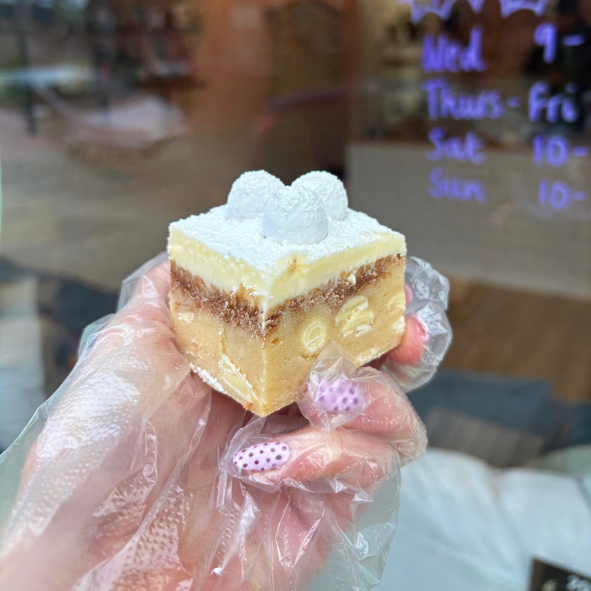 🌀 Cinnamon Roll Blondie - topped with snowballs and icing sugar